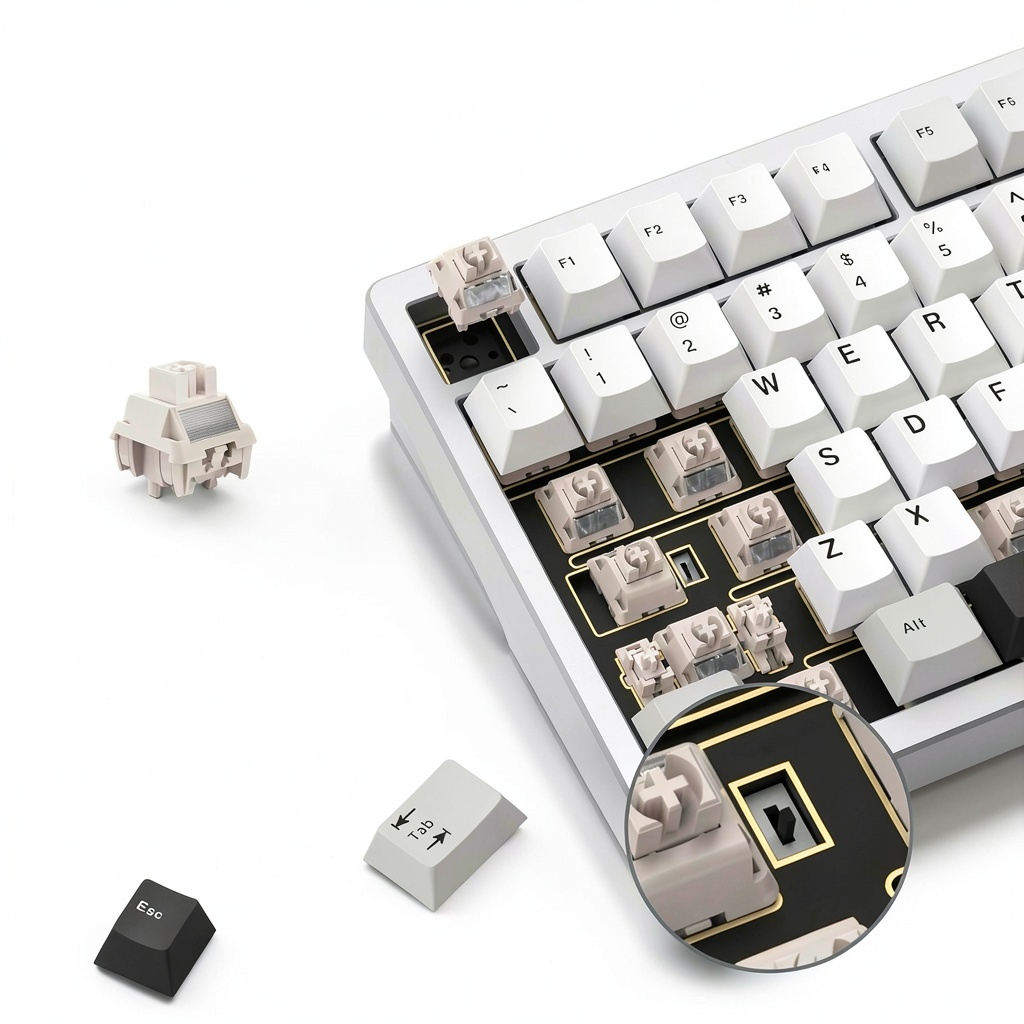 The hot-swappable base supports most 3-pin and 5-pin mechanical switches, allowing easy customization without tools.