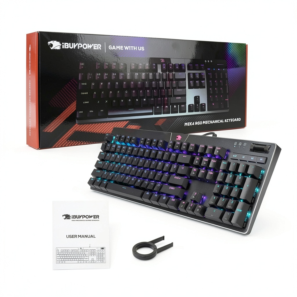 The iBUYPOWER MEK 4 is a full-size wired mechanical gaming keyboard designed for enthusiasts who demand precision and customization. It features tactile brown switches that offer a satisfying keystroke feel without the loud click, making it suitable for both gaming and office environments. The keyboard includes custom RGB lighting controlled through HYTE Nexus software, allowing users to personalize their setup with millions of color options. Built with durability in mind, it comes with a 1-year manufacturer warranty to ensure long-term reliability. Its robust construction and plug-and-play functionality make it easy to integrate into any gaming rig or workstation.