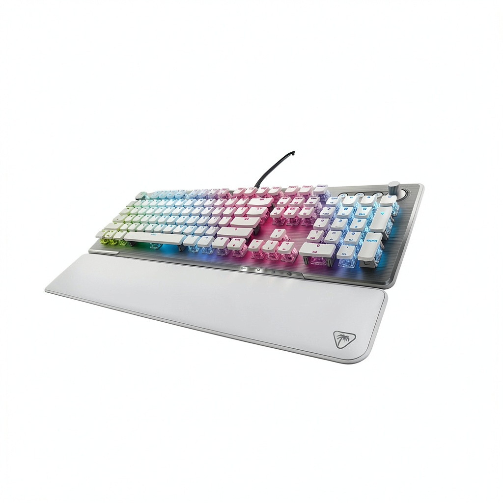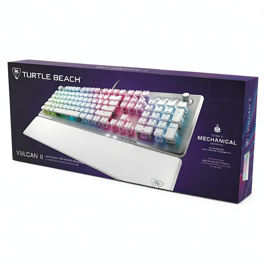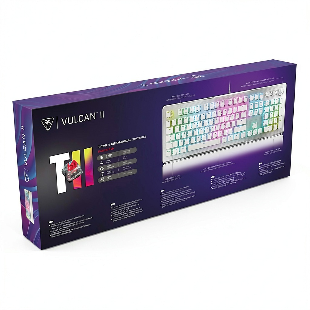 The Turtle Beach Vulcan II is a full-size wired mechanical gaming keyboard engineered with TITAN II switches for fast, tactile feedback and longevity. It boasts RGB illuminated keys that allow for extensive customization via software, enhancing both aesthetics and functionality. Constructed with a durable frame and high-quality keycaps, this keyboard is built to withstand rigorous use. Available in classic black or sleek white, it fits seamlessly into any gaming environment while providing essential features like anti-ghosting and full key rollover for uninterrupted gameplay.